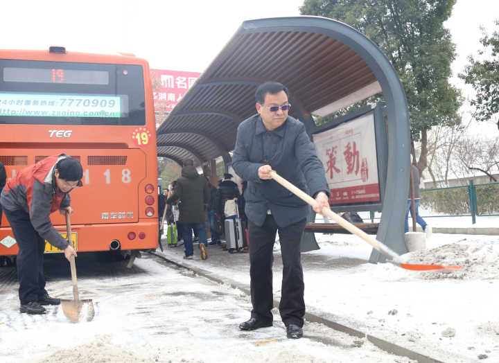 隨后,何董事長一行來到公交總站站臺,看望慰問了堅守在一線工作崗位上的公交員工及駕駛員,并親自帶領(lǐng)集團各位領(lǐng)導(dǎo)在站臺進行鏟雪除冰。在何董的督導(dǎo)支援下,在場的公交干職員工們備受鼓舞、干勁十足,勢要打贏這場抗雪防凍攻堅戰(zhàn),為常德市民出行安全保駕護航。
